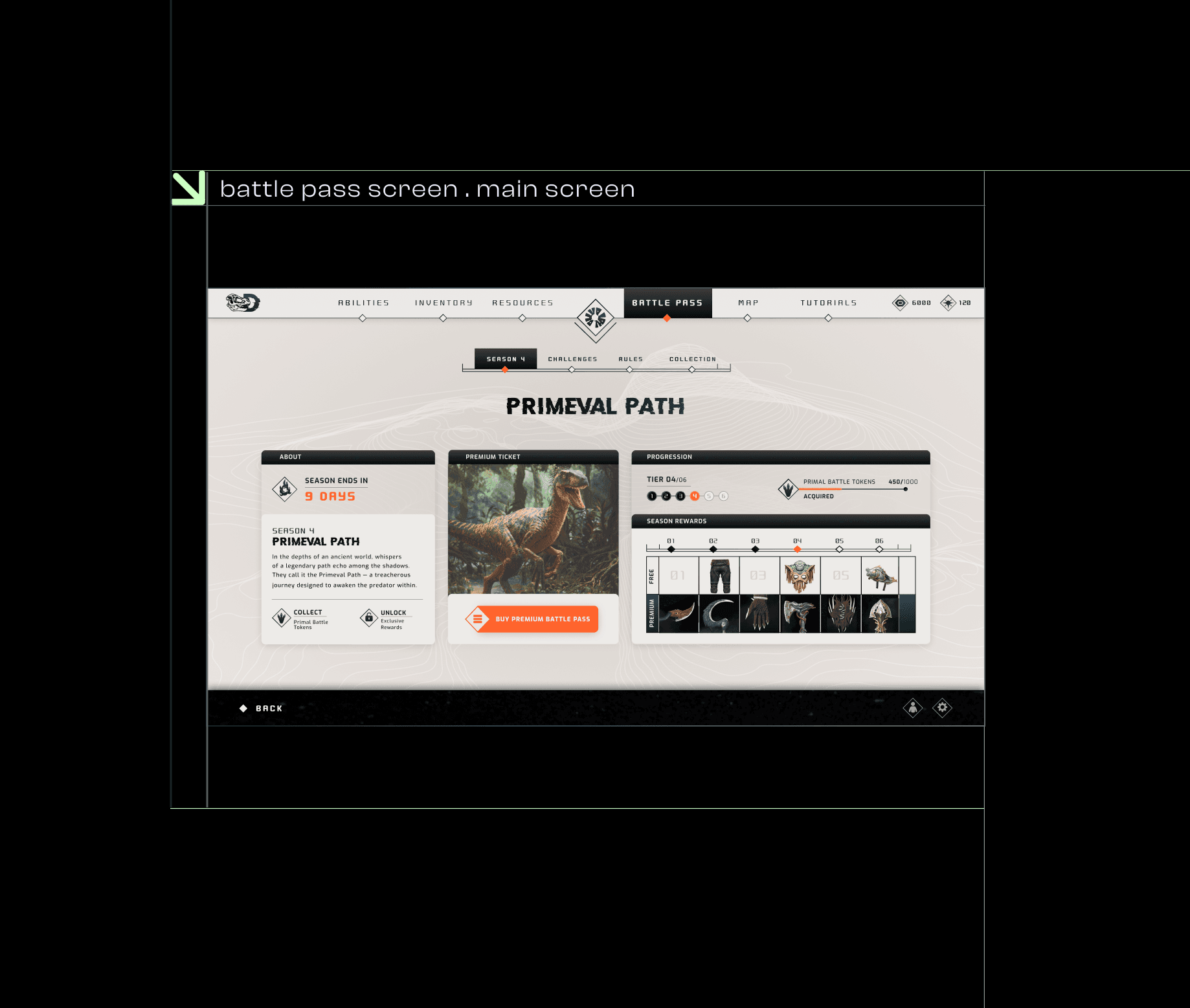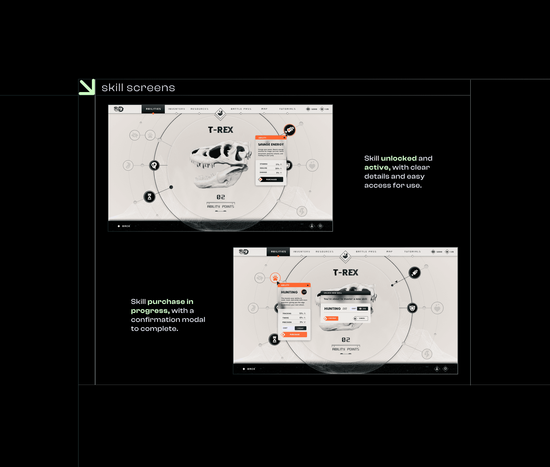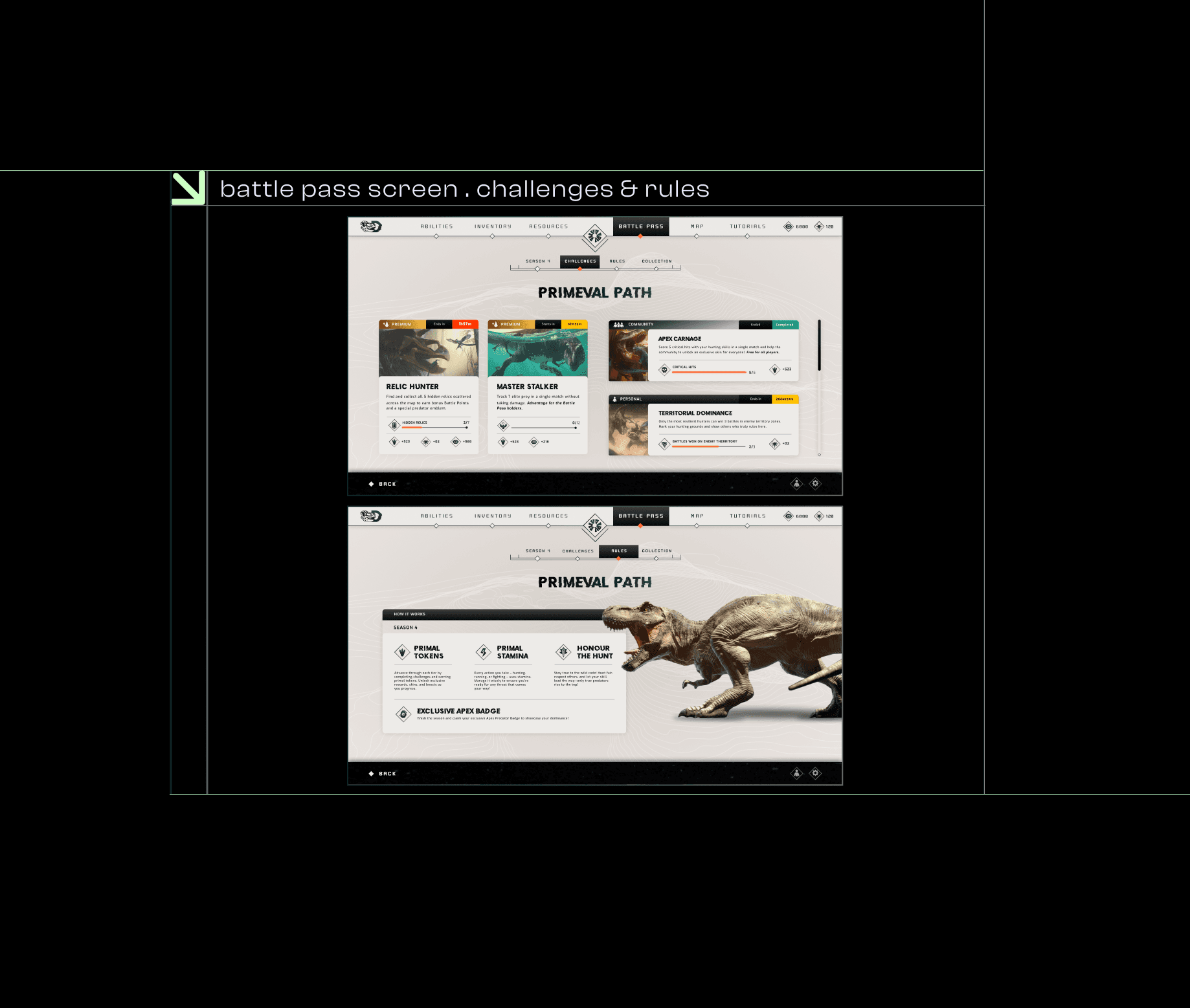 Dark themes are a common choice for many game UIs, particularly in action and RPG genres and it can feel repetitive and lack originality. However, lighter styles are also used in casual or family-friendly games, thinking about that I decided to bring a lighter theme for this survival/multiplayer action game I created for this UI project. For the game concept players control dinosaurs in an open-world adventure, the UI needed to stand out with a fresh and inviting approach. To reflect the dynamic and playful nature of the game, I designed clean, modern screens with a light aesthetic that balances functionality and creativity, offering an intuitive and approachable experience for players.
