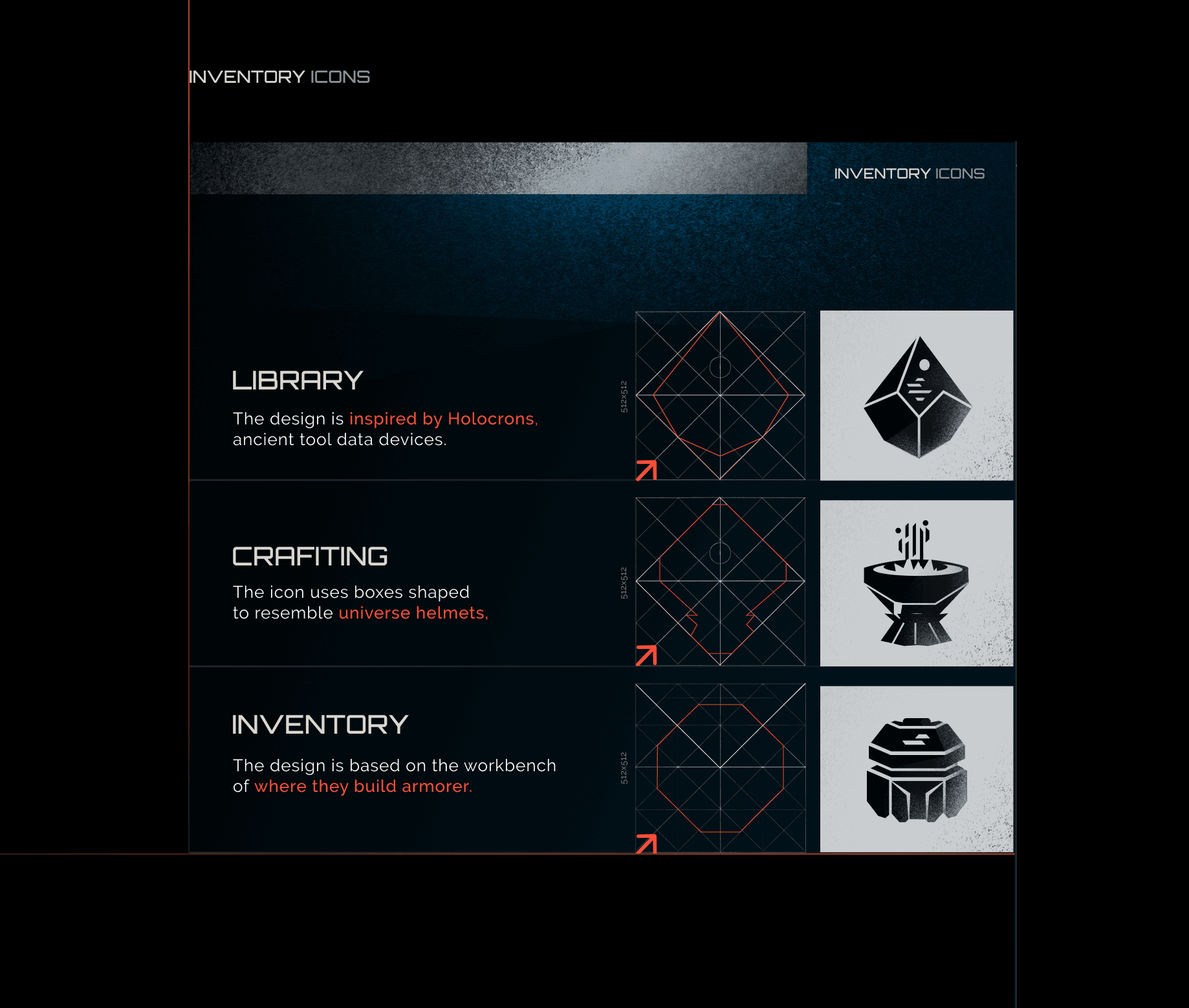 The first step was understanding the visual DNA of the world. I looked at shapes, forms, textures, and recurring design cues to break down what makes this kind of sci-fi universe feel so recognisable. A big focus was on how objects and technology often feel both practical and crafted at the same time, simple in structure, but full of personality. From there, I started identifying which elements could be translated into icons without losing that sense of identity.